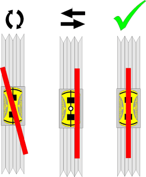 The alignment process is as easy as the mounting. Just turn on the lasers and look at the opposite mounted unit. The laser draws a line on the target label as in the illustration to the right. If necessary, adjust your machine position until the laser lines are aligned with the center mark on both units.