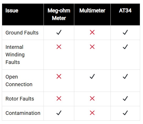 The new AT34 empowers technicians to efficiently and accurately evaluate AC induction squirrel-cage motors (less than 1,000V) for abnormalities such as open connection, ground faults, internal winding faults, stator winding issues, contamination and rotor faults.